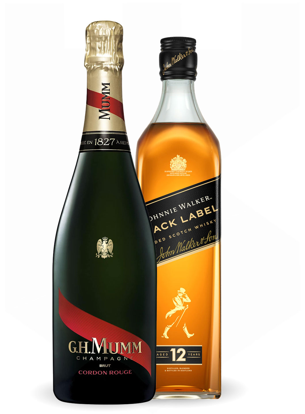 Eleganță în negru și roșu – whisky intens și șampanie rafinată.
